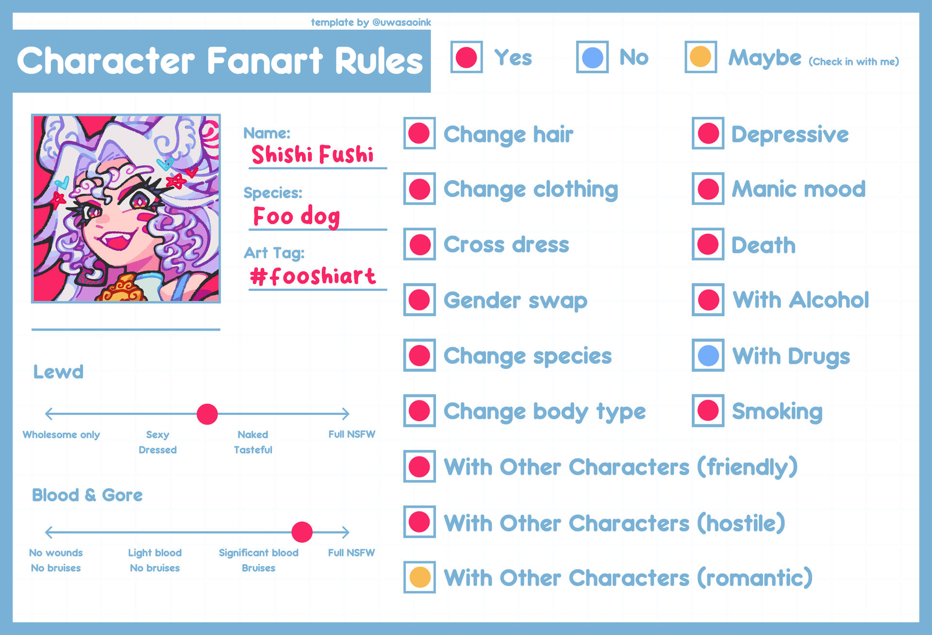 In the event anyone wants to create sexual or NSFW art of Fushi, she can't stop you from doing so (although preferably you'd keep it tasteful), but please bear in mind that she will not interact with this style of content. Please ensure your NSFW art is appropriately hidden / spoilered, WITHOUT using the #fooshiart tag, so the risk of Fushi's general community seeing it is minimised.